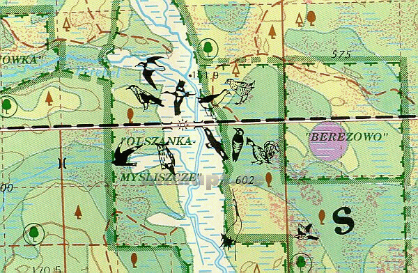 Sehr schön gemachte naturkundliche Landkarte über einen der letzten Urwälder Europas. Ornithologen werden besonders begeistert von den markierten Beobachtungsplätzen von 37 seltenen Vogelarten sein. An der Farbgebung der Waldflächen sind die vorwiegenden Baumarten und das Alter des Bestandes erkennbar. Diese Infomation wird durch eine besondere Symbolik bis zu einzelnen Baumarten verfeinert. Auch für normale Touristen enthält die Karte viel Wissenswertes, z. B. Bushaltestellen mögliche Kanutouren, Unterkünfte (Hotels, Jugendherbergen, Zeltplätze) Baudenkmäler, Krankenhäuser u. v. m. Die Texte liegen auch in deutscher Sprache vor. Herausgeber der Karten ist der Nordpodlassische Bund für Vogelschutz (PTOP) Kartenprobe (polnischer Teil): bild.php?bild=../bilder/makeimg.php?bild=../bilder/