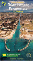 Detailreiche Straßenkarte der Halbinsel Peloponnes mit Höhenlinen. Die Landkarte ist wasserfest und reißfest (plastifiziert). Mit Papp-Cover (entfernbar) und Ortsverzeichnis. Blattübersicht der ANAVASI-Karten: