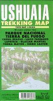 Topographische Trekkingkarte des Ushuaia Nationalparks und Feuerland mit Trekkingrouten und Campingplätzen sowie einer Detailkarte Pista de Esqui de Fondo Francisco Jerman (Club Andino Ushuaia) 1:7.000 mit Höhenprofil und einem Stadtplan von Ushuaia.