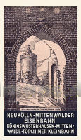 Die Karte zeigt die Streckenverläufe der Neukölln-Mittenwalder Eisenbahn und der Kleinbahn von Königs Wusterhausen und Mittenwalde nach Töpchin. Ein Fahrplan und die Preise stehen neben der Karte.