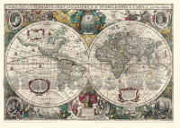 Farbenprächtiger Nachdruck, Lieferung gerollt, Blattgröße (B x H) 67 x 48 cm, Bedrucktes Blatt (B x H) 63 x 43,5 cm. Origilalmaßstab ca. 1:92 000 000 - aber die Darstellung um 10 % vergrößert zum Original. Kartographen: Henricus Hondius (1597-1651) und Johann Janssonius [auch Jan Jansson] (1588-1664).