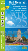 Topographische Wanderkarte für die Gegend um Bad Neustadt an der Saale mit Wanderwegen und Radwanderwegen. Für Touristik und Freizeit bietet die ATK25 in Verbindung mit einer plastischen Geländeschummerung das aktuelle Netz der Wanderwege (Rot) und Radwege (Grün). Einzelne touristische Hinweise und Symbole ergänzen die Kartendarstellung. Das eingetragene UTM-Kilometergitter gewährleistet dem GPS-Nutzer Koordinatensicherheit. Gegenüber den Rahmenblättern (herkömmliche Blätter im Regelblattschnitt) 1:25.000 stellt ein ATK25-Kartenblatt eine 3,5-fach größere Kartenfläche dar. Die einzelnen Karten haben zu Ihren Nachbarblättern einen 4 km breiten Überlappungsbereich. Kartenbeispiel aus der Serie Blattübersicht (externer Link)