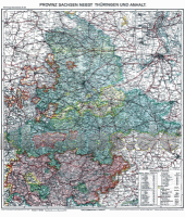 Regierungsbezirk MAGDEBURG mit den Stadtkreisen: Aschersleben, Halberstadt, Magdeburg, Quedlinburg sowie Stendal und den Landkreisen Calbe a./S., Gardelegen, Halberstadt, Haldensleben, Jerichow I, Jerichow II, Oschersleben (Bode), Osterburg, Quedlinburg, Salzwedel, Stendal, Wanzleben, der Grafschaft Wernigerode und Wolmirstedt. Regierungsbezirk MERSEBURG mit den Stadtkreisen: Eisleben, Halle a. d. Saale, Weißenfels sowie Zeitz und den Landkreisen Bitterfeld, Delitzsch, Eckartsberga, Liebenwerda, Mansfelder Gebirgskreis, Mansfelder Seekreis, Merseburg, Naumburg, Querfurt, Saalkreis, Sangerhausen, Schweinitz, Torgau, Weißenfels, Wittenberg und Zeitz. Regierungsbezirk ERFURT mit den Stadtkreisen: Erfurt, Mühlhausen und Nordhausen sowie den Landkreisen Erfurt, der Grafschaft Hohenstein (Nordhausen), Heiligenstadt, Langensalza, Mühlhausen, Schleusingen, Weißensee, Worbis und Ziegenrück. Farblich markiert wurden auf der Karte (inklusive der jeweiligen FLÄCHEGRÖßE] die Provinz Sachsen, der Staat Sachsen, Anhalt und Sachsen-Weimar-Eisenach; Sachsen-Coburg-Gotha, Sachsen-Altenburg, Sachsen-Meiningen, Schwarzburg-Sondershausen, Schwarzburg -Rudolstadt, Reuss ältere Linie und Reuss jüngere Linie.