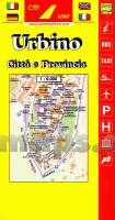Stadtplan von Urbino mit Straßenverzeichnis und Innenstadtplan 1:3.500. Die Rückseite der Landkarte enthält eine Umgebungskarte.