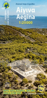 Beidseitig bedruckte Karte von der griechischen Insel Ägina. Die Rückseite enthält eine Übersicht der Insel mit entsprechenden Bezugspunkten zu touristischen Highlights. Blattübersicht der ANAVASI-Karten: