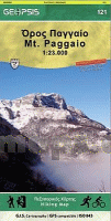 Detailreiche wasserfeste topographische Wanderkarte des Pangaion / Pangeo in Nord-Griechenland. Beschreibungen der wichtigsten Wanderrouten in englischer Sprache. Mit gesonderter Karte der Zufahrtswege, einer Wald-Vegetationskarte und einer Höhenschichtenkarte.