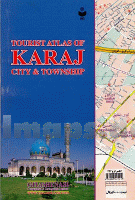 Stadtplanatlas der iranischen Stadt Karadsch. Alle Beschriftungen in arabischer Schrift, größere Straßen auch Lateinisch. Straßenregister und touristische Beschreibungen auch in Lateinisch.