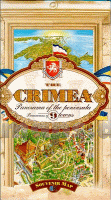 Detaillierte Panoramakarte der Halbinsel Krim und 9 Panoramas von Bachtschisarais Palast-Museum, Sewastopols Chersones von Tauria-Museum, vom Woronzow-Palast in Alupka, der Genueser Festung von Sudak, von Aluschta, Gurzuf, Jewpatoria, Feodosia und Jalta.