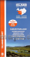 Topographische Straßenkarte von Südwest-Island mit touristischen Informationen und Sehenswürdigkeiten in isländischer, englischer, deutscher und italienischer Sprache. Eine Entfernungstabelle ist ebenso enthalten wie Informationen über Verkehrswege, Schwimmbäder, Museen und Campingplätze.