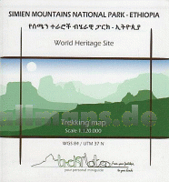 Trekkingkarte vom Simen-Gebirge. Auf der Rückseite sind 8 Touren beschrieben und zusätzlich gibt es allgemeine Informationen über die Geschichte, Flora und Fauna.