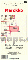 Topographische Landkarte von Marokko auf Grundlage der OpenStreetMap und aus anderen Quellen. Entsprechend dem aktuellen Fortschritt der Kartengrundlage sind außerordentlich viele kleine Details im Wegenetz erkennbar. Alle Beschriftungen erfolgen soweit verfügbar in Englisch und Arabisch. Enthält Höhenlinien, Pässe und Geländeschattierung. Verschiedene touristisch interessante Punkte sind besonders hervorgehoben, z.B.: Zeltplätze, Hotels, Einkaufsmöglichkeiten, Restaurants. Blattschnitte der Marokko-Straßenkarten von ProjektNord
