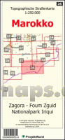 Topographische Landkarte von Marokko auf Grundlage der OpenStreetMap und aus anderen Quellen. Entsprechend dem aktuellen Fortschritt der Kartengrundlage sind außerordentlich viele kleine Details im Wegenetz erkennbar. Alle Beschriftungen erfolgen soweit verfügbar in Englisch und Arabisch. Enthält Höhenlinien, Pässe und Geländeschattierung. Verschiedene touristisch interessante Punkte sind besonders hervorgehoben, z.B.: Zeltplätze, Hotels, Einkaufsmöglichkeiten, Restaurants. Blattschnitte der Marokko-Straßenkarten von ProjektNord