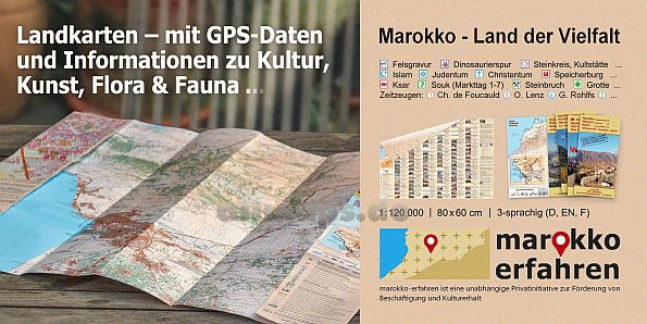 ![]() Gern "verstecken" wir, Andreas und Barbara Conrad uns hinter dem Namen marokko erfahren, der doch so viel mehr von unseren Gedanken und Zielen verrät. Seit 1991, dem Jahr unseres ersten Besuches im Land waren wir von Marokkos kultureller Vielfalt, der Offenheit, Freundlichkeit und Gastfreundschaft seiner Bewohner fasziniert. Baukunst und Historie der Imazighen ("Berber") begeisterte uns immer mehr und bei der intensiven Beschäftigung mit Kultur und Geschichte stießen wir auf weitere touristisch interessante Sehenswürdigkeiten: nicht nur die Dinosaurier haben hier Spuren hinterlassen, auch für die frühzeitliche Besiedlung durch den Menschen gibt es zahlreiche Zeugnisse. Unser Projekt, möglichst vielen Menschen die bekannten und unbekannten kulturellen Sehenswürdigkeiten nahe zu bringen, nahm Form an. Mit unseren Publikationen - begleitet von guter Kartographie durch Prof. Dr. Uwe Ulrich Jäschke aus Dresden kann jede Zielgruppe ihre Wunschziele erreichen, kann individuell Marokko erfahren. Zugleich führt diese Öffentlichkeit zu angemessener Wertschätzung der Sehenswürdigkeiten und möglicherweise zum Erhalt der teilweise aufgegebenen Kulturschätze. |