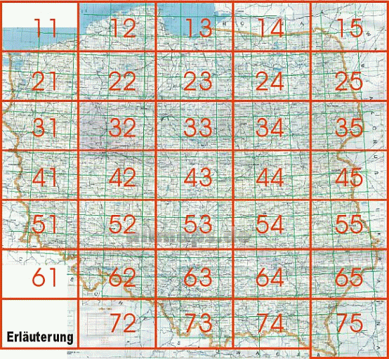 HINWEIS: Die dicken grünen Linien geben die 1:100.000 Blattschnitte wieder. diese teilen sich in 8x 1:50.000. Teilweise sind Doppelblätter erhältlich.